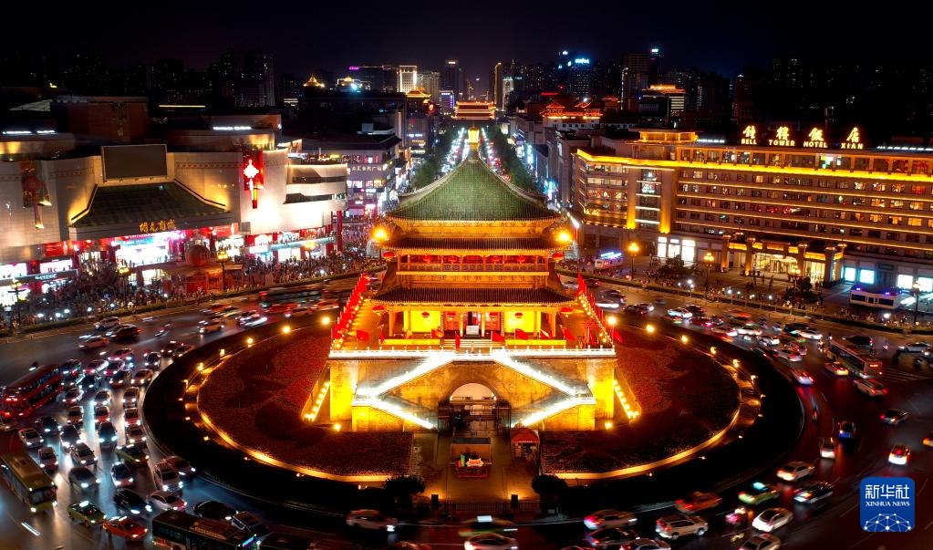 西安钟楼夜景(5月2日摄,无人机照片)。