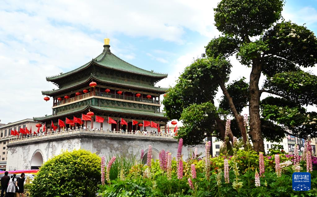 一名游客在西安钟楼附近参观(5月2日摄)。