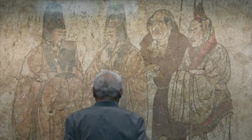 这是在陕西历史博物馆拍摄的唐章怀太子墓《客使图》(局部)(5月11日摄)。《客使图》描绘的是唐代外交机构鸿胪寺官员接待外国使节的场景。