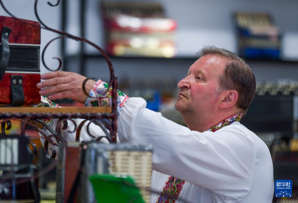 在位于伊宁市六星街的亚历山大手风琴珍藏馆,亚历山大在整理摆放手风琴(5月16日摄)。