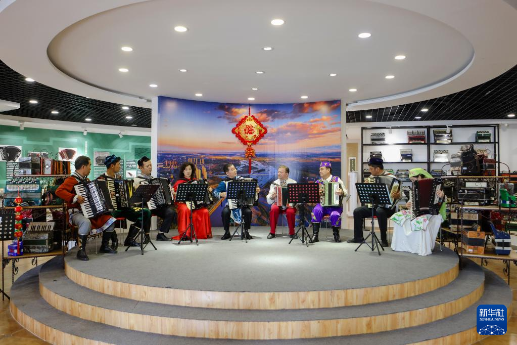 在位于伊宁市六星街的亚历山大手风琴珍藏馆,手风琴乐队在为游客演出(5月16日摄)。