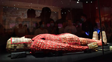 5月18日,游客在西夏博物馆欣赏展出的西夏文物。