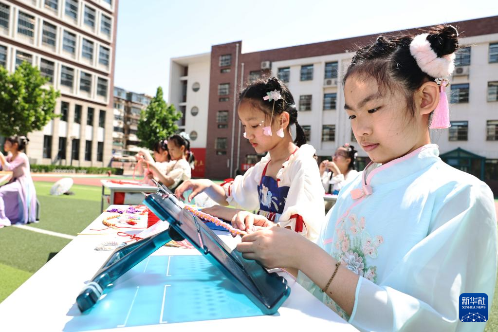 5月22日,天津市南开区中心小学学生身着汉服进行传统手工制作。