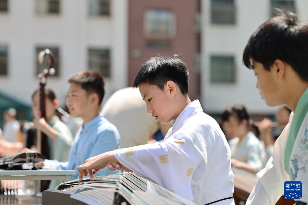 5月22日,天津市南开区中心小学学生身着汉服进行古筝演奏。