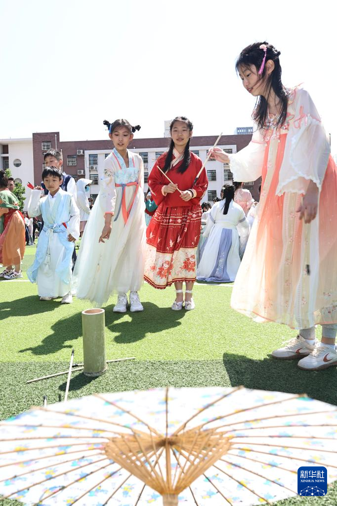 5月22日,天津市南开区中心小学开展传统文化美育活动,师生身着汉服,开展书法、舞狮、投壶、古筝演奏、象棋对弈等活动,感受传统文化的魅力。