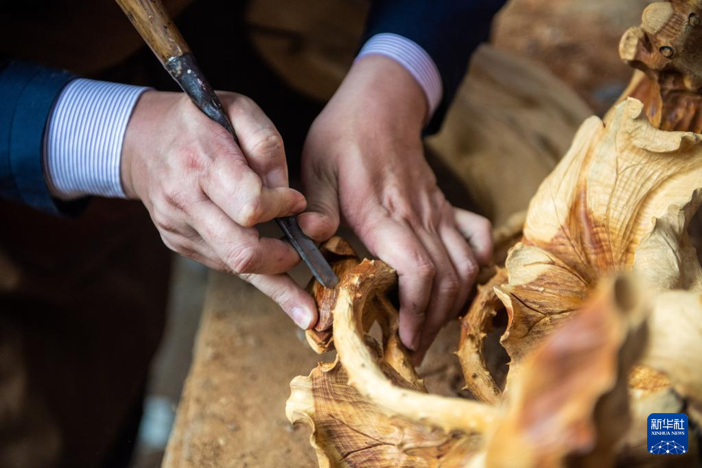 5月23日,在洞口县岩山镇阳家山村,洞口木雕非遗传承人傅立先在创作木雕作品《丝绸之路》。