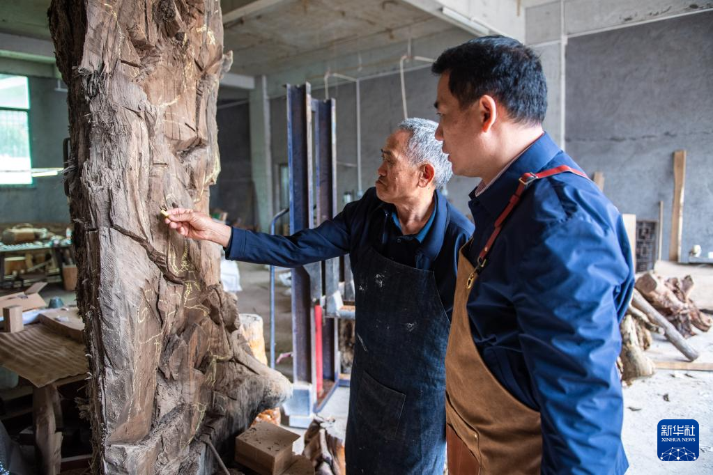 5月23日,在洞口县岩山镇阳家山村,洞口木雕非遗传承人傅立先(左)和父亲傅金林在创作木雕作品。
