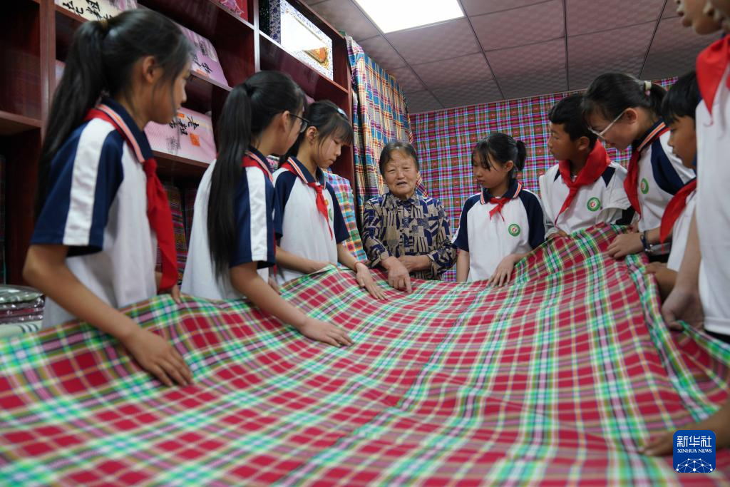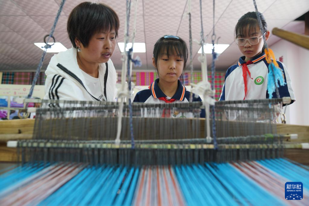 5月24日,民间艺人在河北省沙河市塔子峪村非遗传习所内为小学生讲解四匹缯布制作技艺。