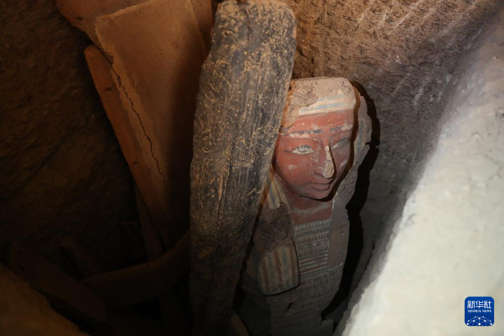 5月27日,媒体记者在埃及塞加拉地区举行的考古新闻发布会上拍摄一具彩绘木乃伊木棺。