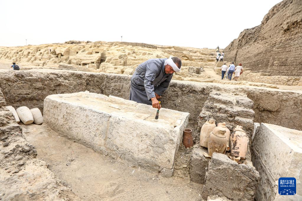 5月27日,一名工作人员在埃及塞加拉地区考古发掘现场工作。