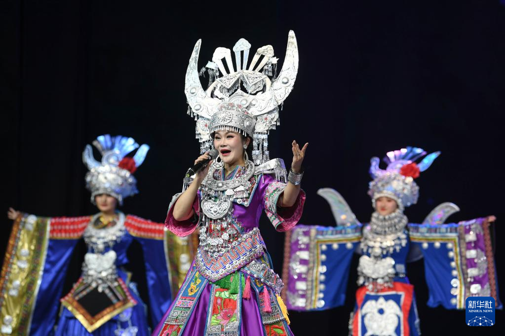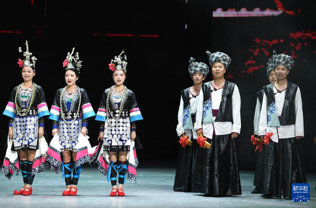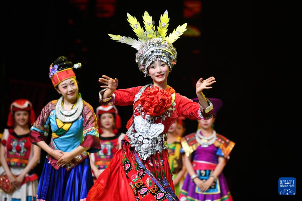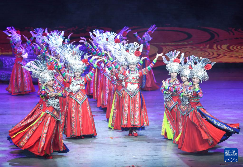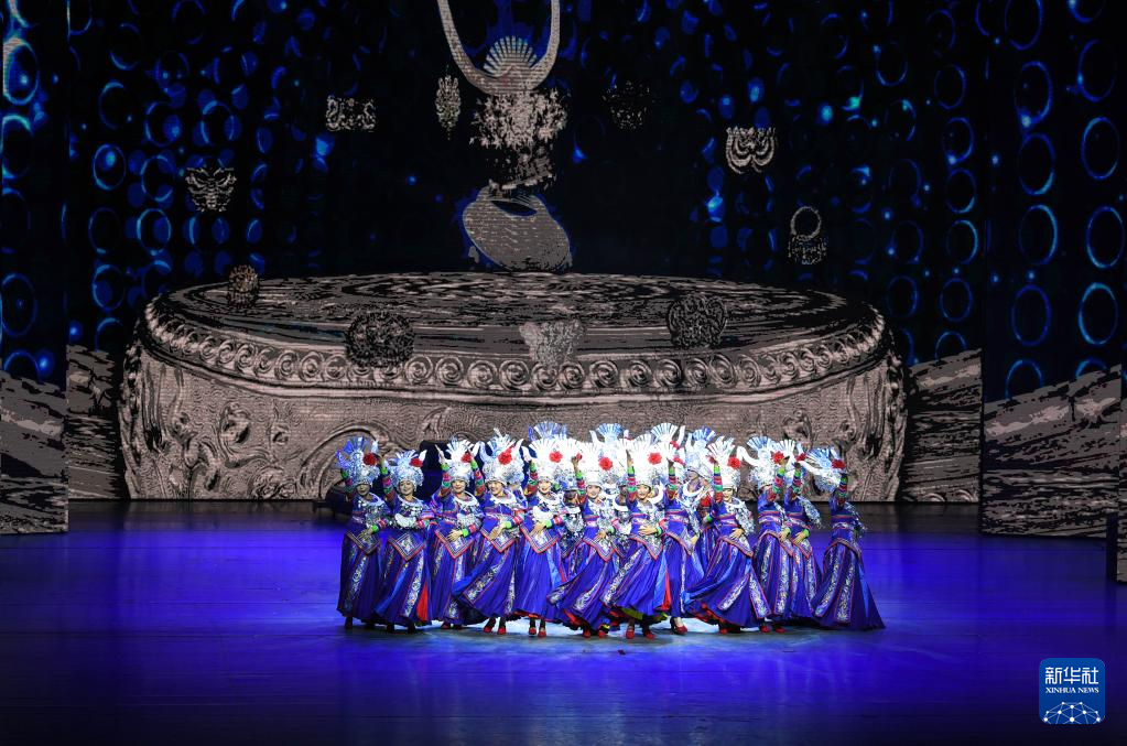 6月5日,演员在贵阳大剧院的《多彩贵州风》演出中表演节目《金绣银饰》。