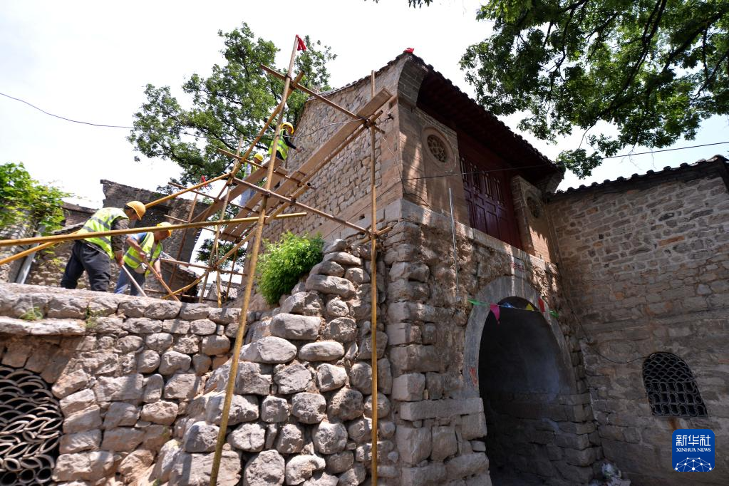 6月7日,施工人员在河北省石家庄市井陉县小梁江村进行古建筑修缮。