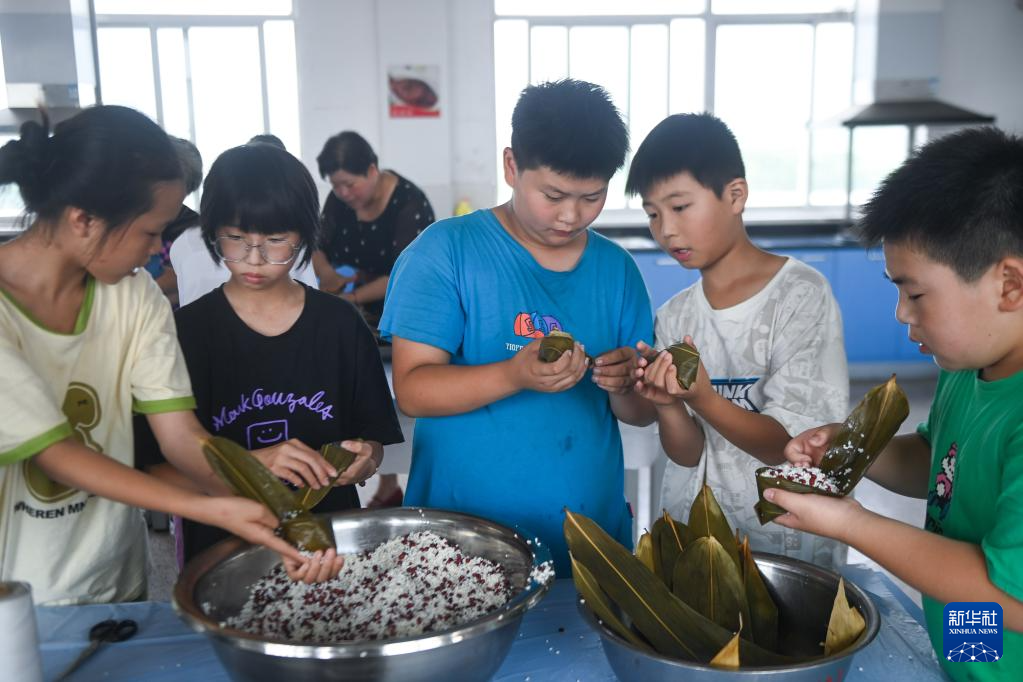 6月8日,学生们在传统习俗课上学习包粽子。