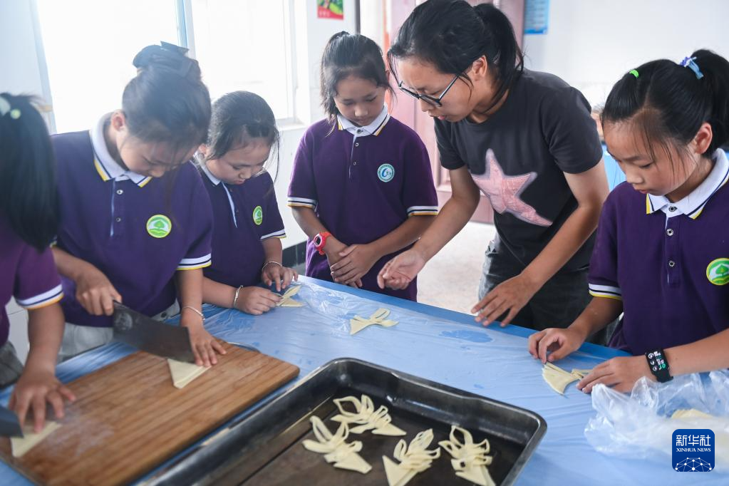 6月8日,学生们在传统习俗课上学习做当地特色美食——麦花。