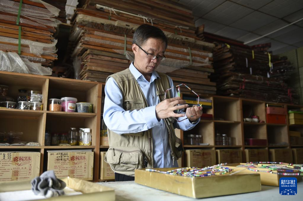 6月7日,张俊涛在工作室内整理制作彩灯的原料。