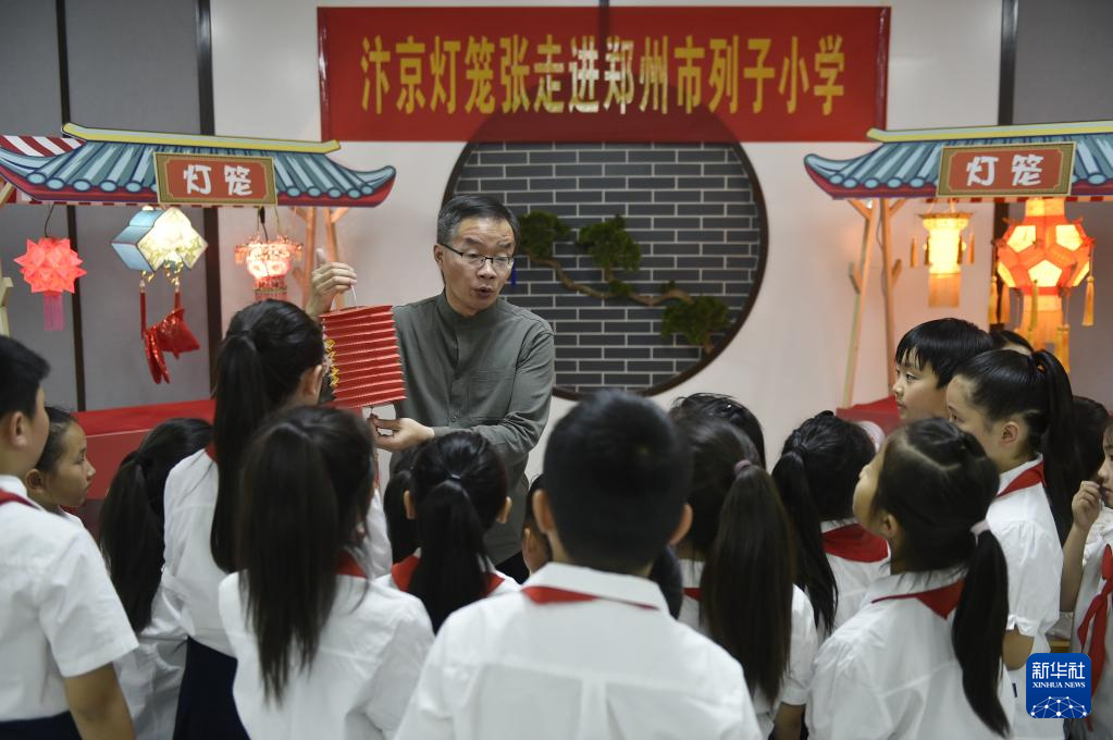 6月8日,张俊涛(前左)在郑州经济技术开发区列子小学参加非遗进校园活动,向学生们介绍彩灯制作技艺。