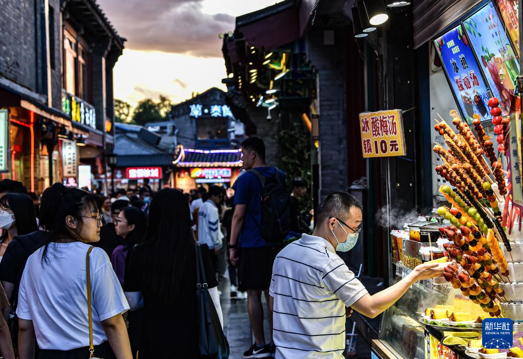 6月10日,人们在北京什刹海附近的烟袋斜街买小吃。