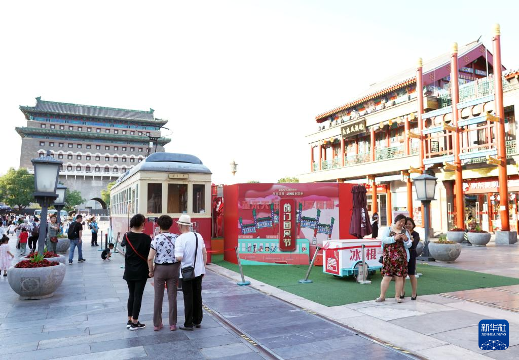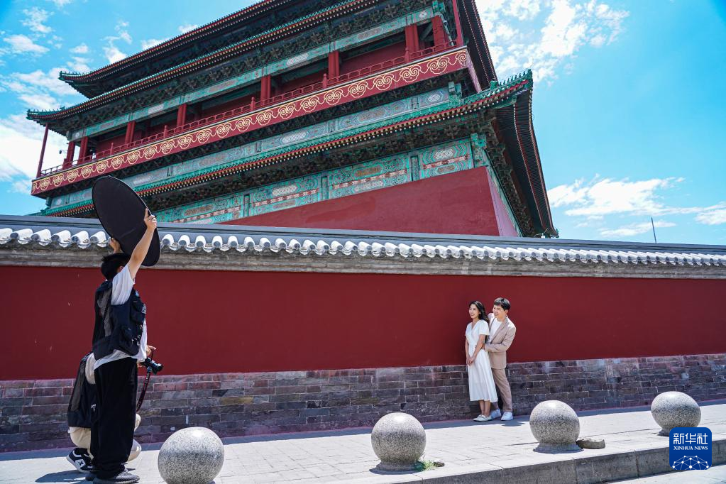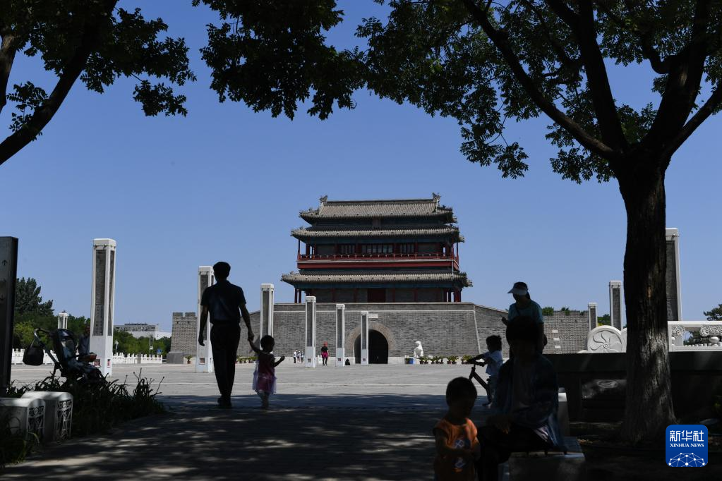6月6日,人们在北京永定门公园的永定门城楼前玩耍。