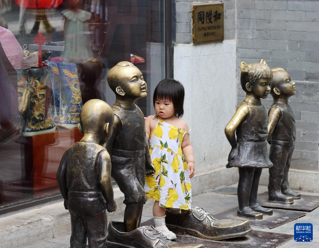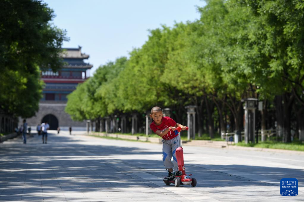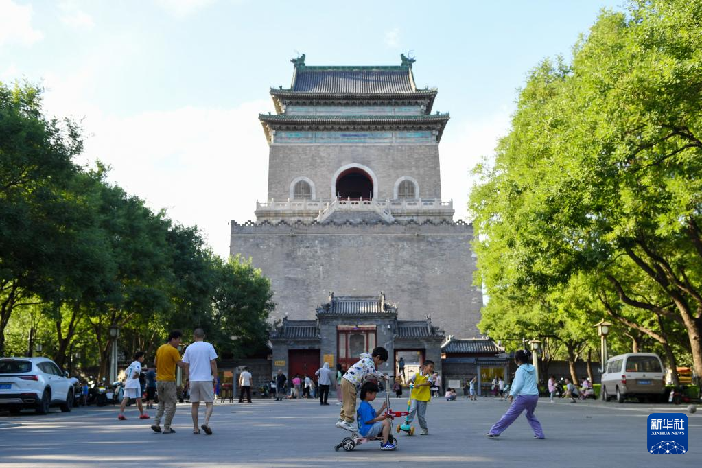 6月9日,小朋友在北京钟鼓楼文化广场玩耍。