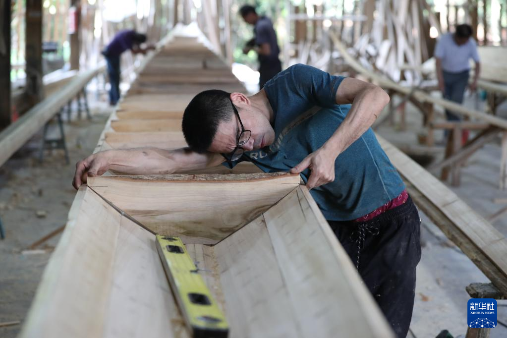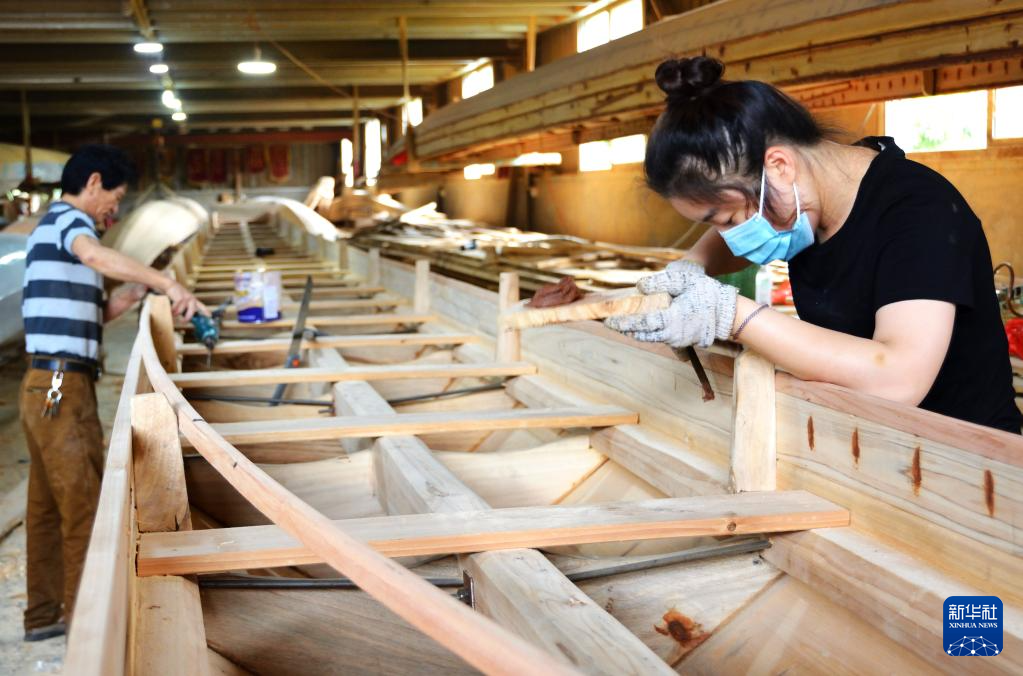 在福州市闽侯县方庄村方和猛龙舟厂,匠人在制造龙舟(6月12日摄)。