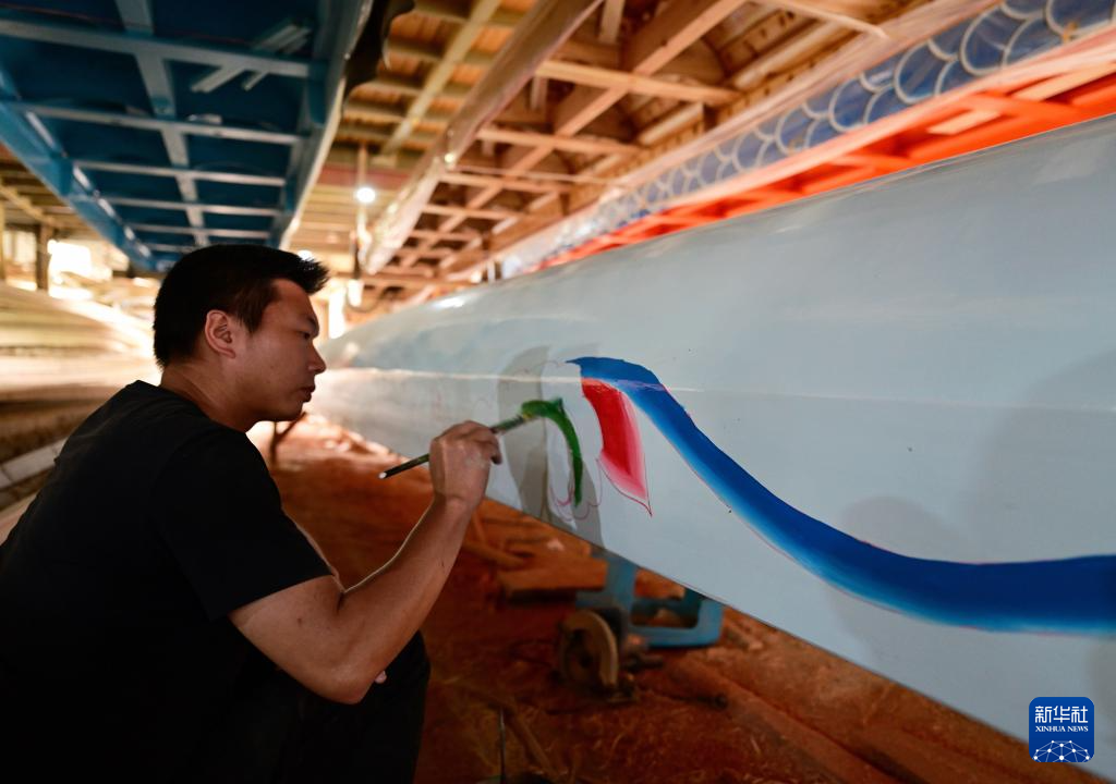 在福州市闽侯县方庄村“龙舟世家”方忠雄龙舟厂,一名龙舟画师为新龙舟画上花纹(5月23日摄)。