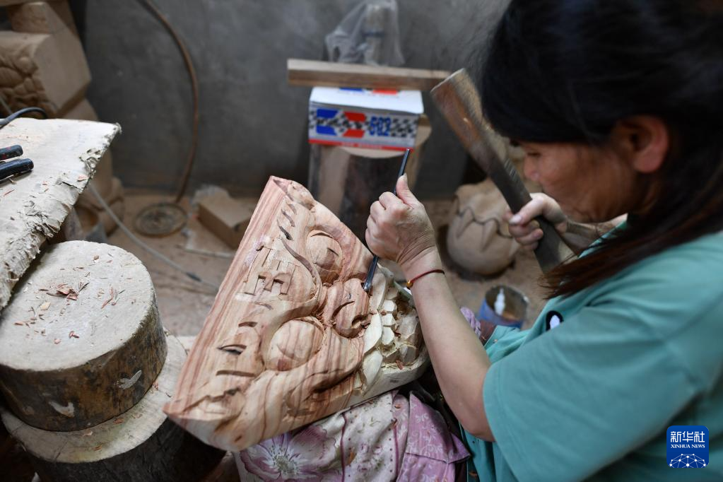 福州市闽侯县方庄村匠人在雕刻龙舟虎头牌(6月12日摄)。