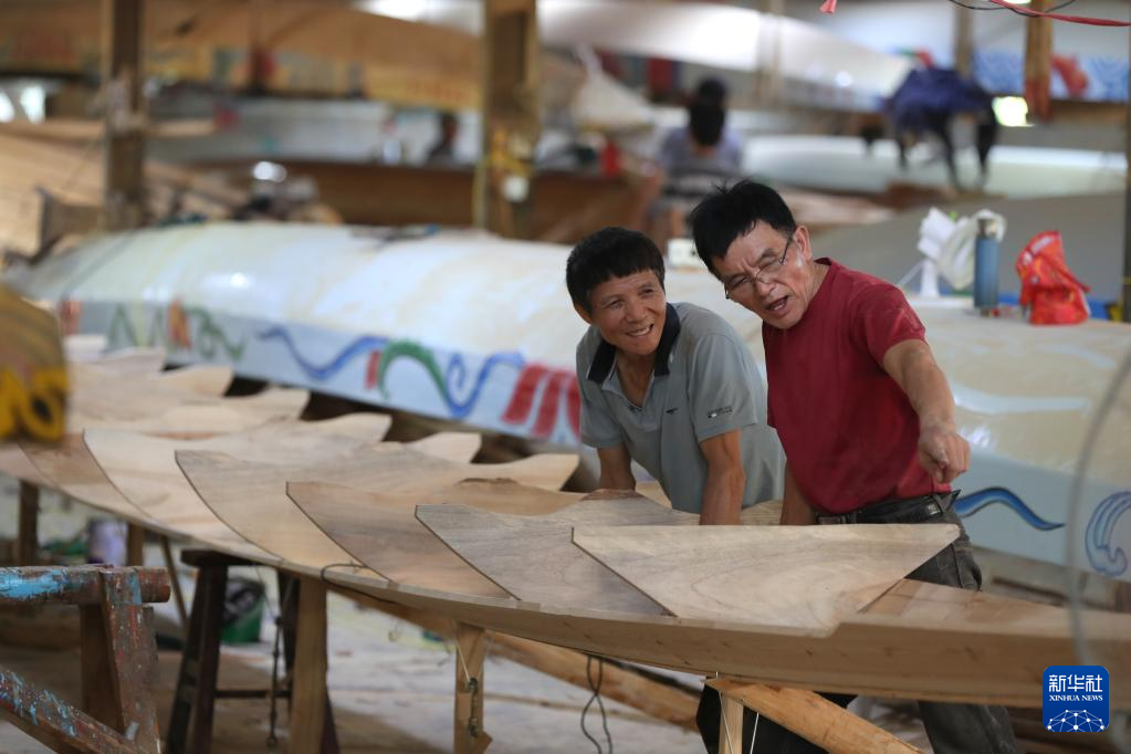 在福州市闽侯县方庄村“龙舟世家”方忠雄龙舟厂,两位匠人在制造龙舟时讨论(6月12日摄)。