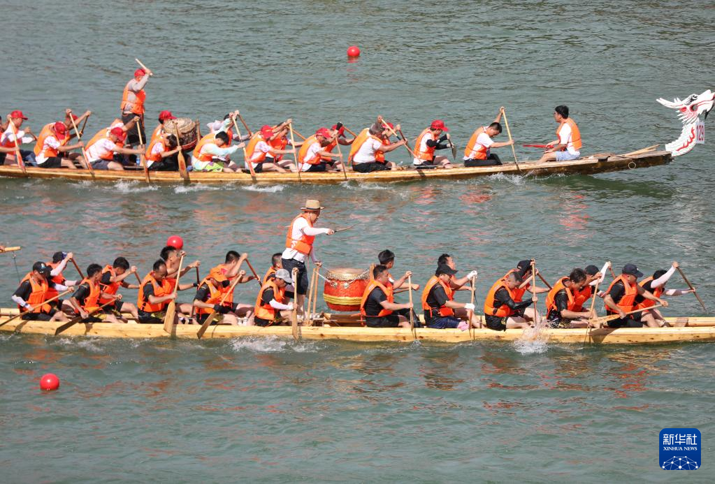 端午节临近,湖南道县举行非遗龙船赛,众多龙船在潇水河上竞渡,迎接佳节到来。