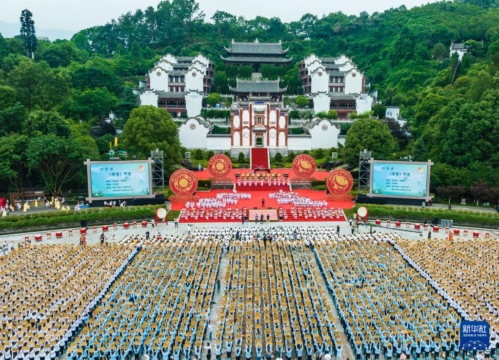 6月21日,嘉宾与当地居民在开幕式上共同诵读屈原作品《离骚》(无人机照片)。