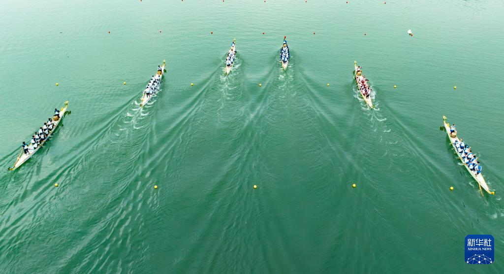 6月21日,来自海内外的龙舟代表队在秭归县徐家冲港湾参加2023年国际划联龙舟世界杯预赛(无人机照片)。