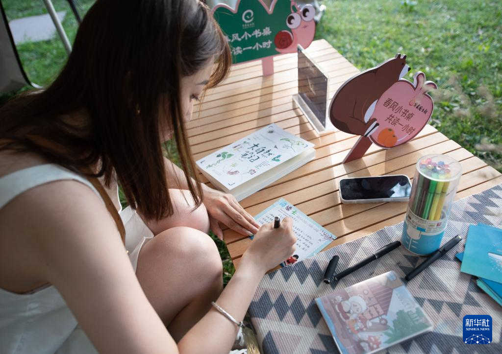 7月8日,在银川市森林公园,读者写下阅读感想。