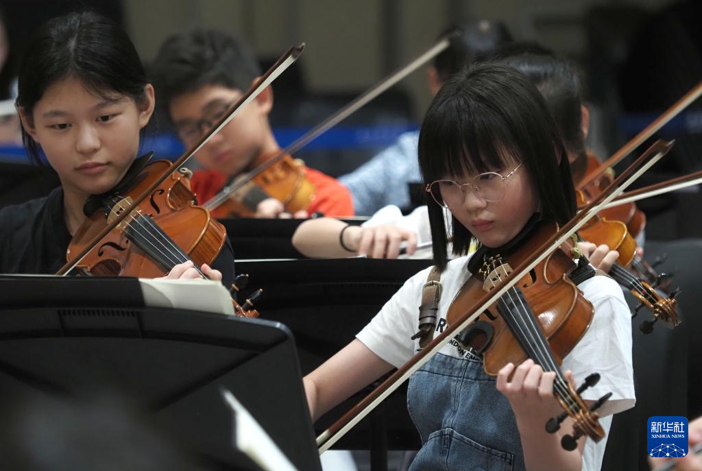 7月11日,“MISA学生节日乐团”弦乐声部的学生在进行首次联排。