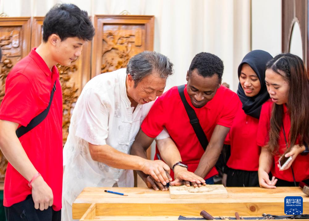 7月13日,泰州木雕省级代表性非遗传承人帅春燕(左二)为留学生们讲解木雕的雕刻工艺。