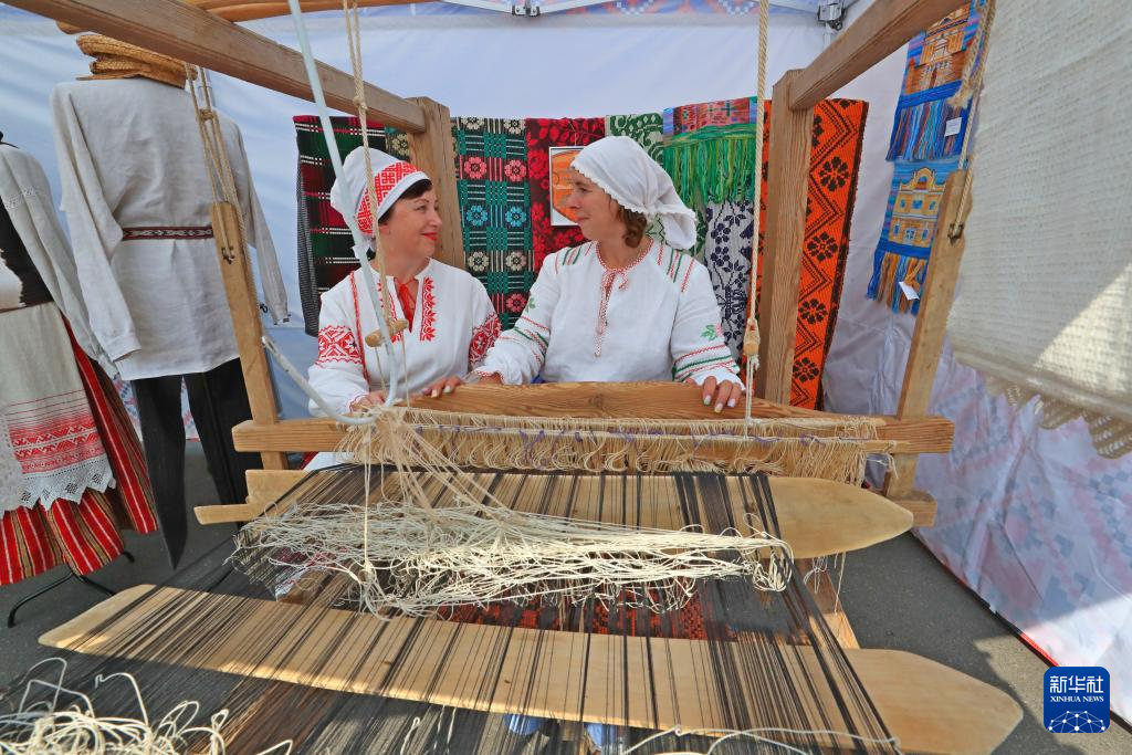 7月14日,参展人员在白俄罗斯维捷布斯克“斯拉夫巴扎”国际艺术节上演示传统织布。
