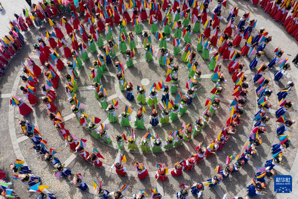7月15日,地戏艺人在贵州省安顺市西秀区旧州镇开展地戏巡游(无人机照片)。