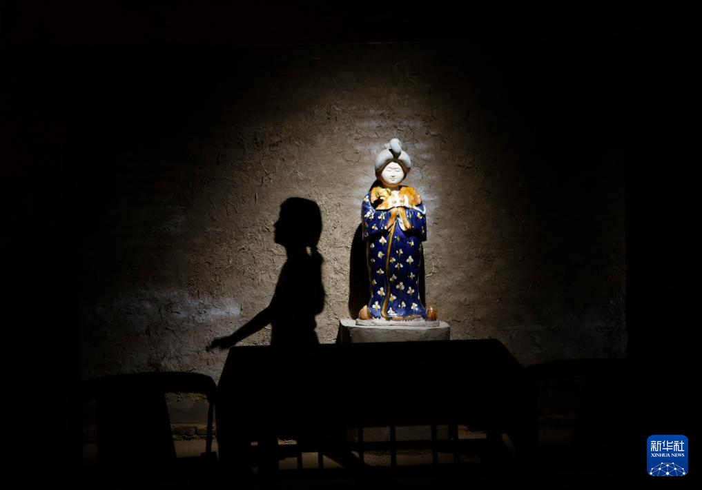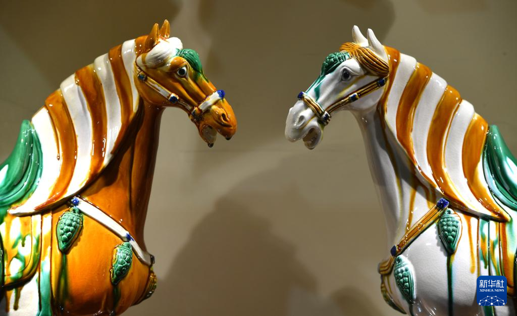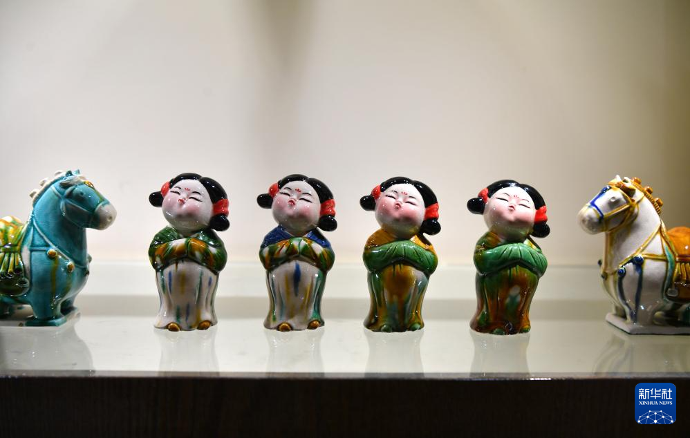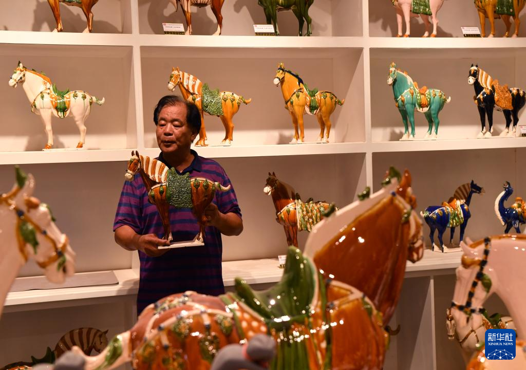 这是7月19日在南石山村一家生产企业的展厅里拍摄的唐三彩作品。
