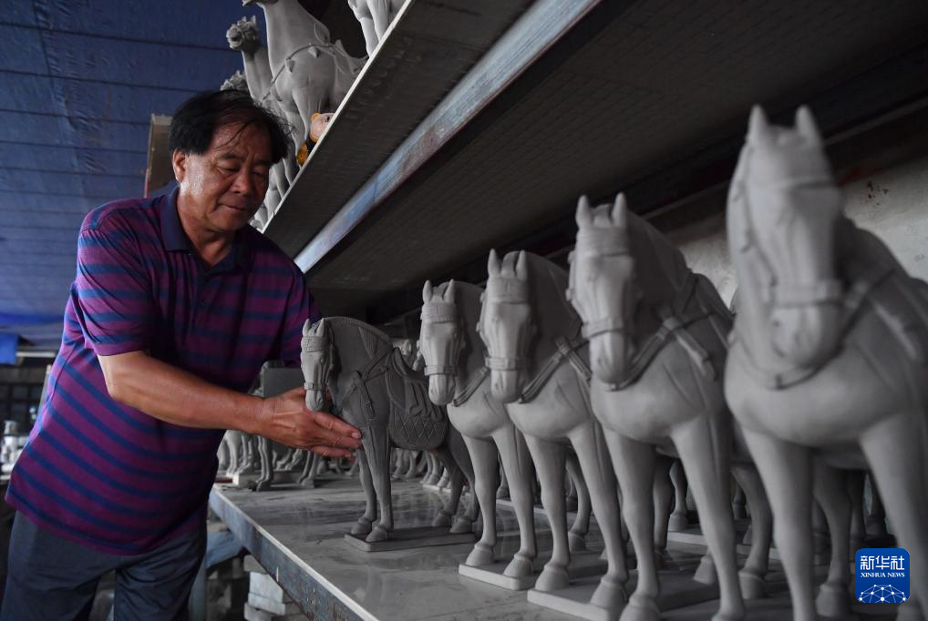 7月20日,在南石山村一家生产企业的车间里,唐三彩艺人张二孬在整理做好的泥胎。