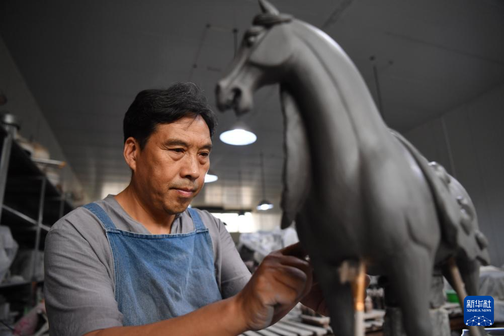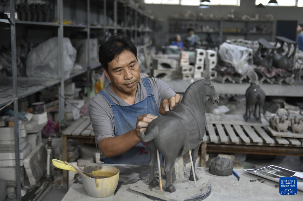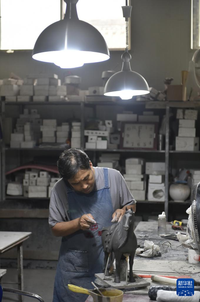 7月19日,在南石山村一家生产企业的车间里,唐三彩艺人高顺旺在雕刻泥胎。