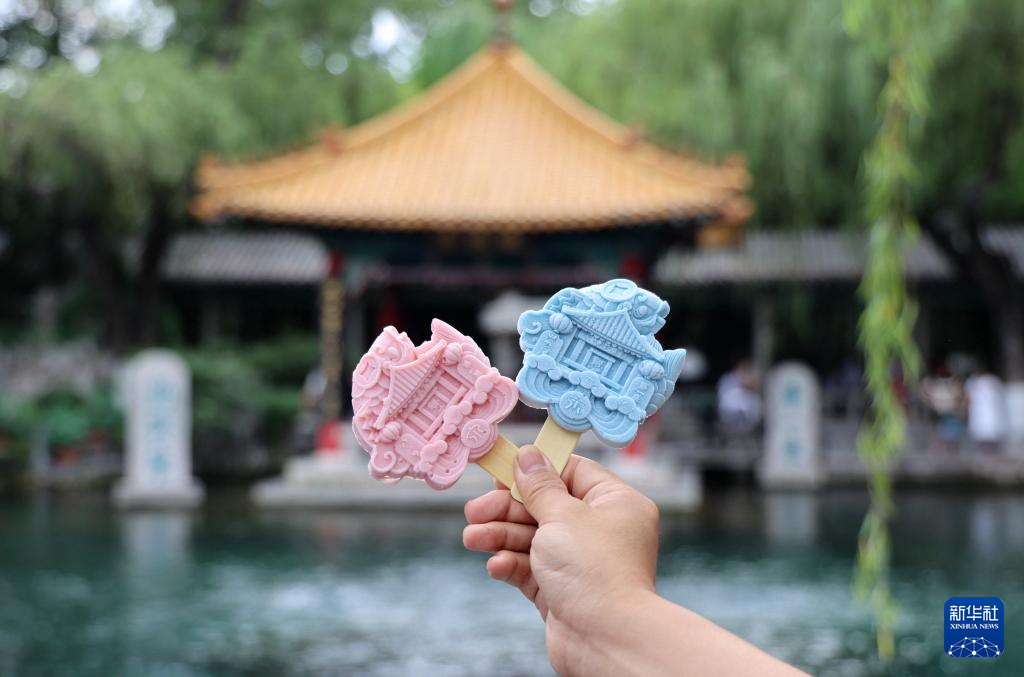 7月16日在山东省济南市趵突泉景区拍摄的趵突泉造型文创雪糕。