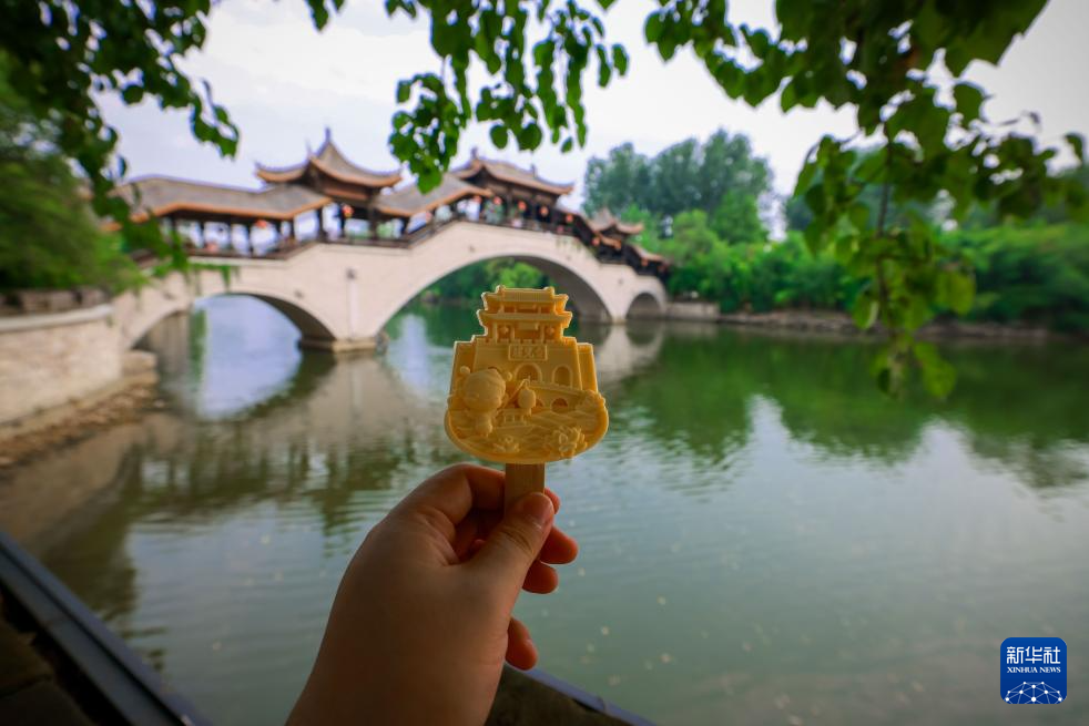 这是7月20日在山东省枣庄市台儿庄古城拍摄古建筑造型文创雪糕。