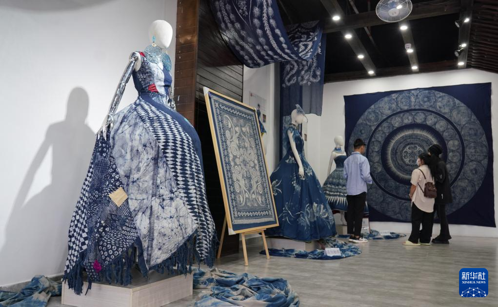 7月21日,游客在贵州省黔东南苗族侗族自治州丹寨县万达小镇苗族蜡染非遗展示馆观赏蜡染展品。