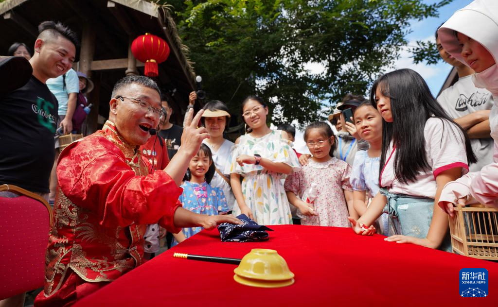 7月21日,非遗传承人在贵州省黔东南苗族侗族自治州丹寨县万达小镇表演“古彩戏法”。