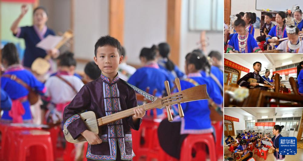 拼版照片:左图为广西三江侗族自治县9岁的小学生潘文祥;右图为潘文祥在县文化馆非遗公益培训班上学习弹唱侗族琵琶歌(照片均摄于7月13日)。暑假期间,三江侗族自治县文化馆举办侗族琵琶歌公益培训班,喜欢吹奏侗族乐器的潘文祥报名参加。