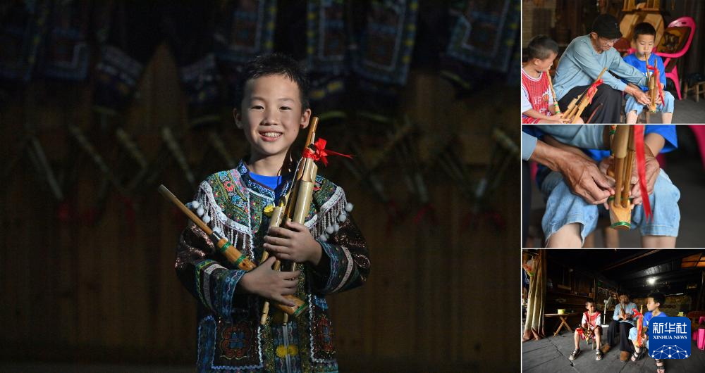 拼版照片:左图为广西融水苗族自治县杆洞乡党鸠村9岁的小学生梁文雄(7月5日摄);右图为梁文雄跟着爷爷学习吹奏芦笙(照片均摄于7月6日)。梁文雄很喜欢吹芦笙,每到假期,他都会跟爷爷、爸爸学习吹芦笙。
