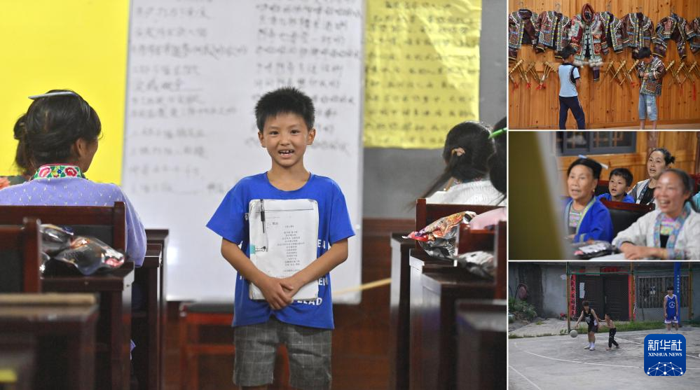 拼版照片:左图为广西融水苗族自治县杆洞乡党鸠村乌英苗寨8岁的小学生吴良友(7月6日摄);右上图为吴良友(左)在民俗活动前等待更换民族服饰(7月6日摄);右中图为吴良友跟着妈妈在夜校学习唱苗歌(7月5日摄);右下图为吴良友(左二)和哥哥在打篮球(7月15日摄)。暑假期间,吴良友经常跟妈妈到夜校学习唱苗歌。