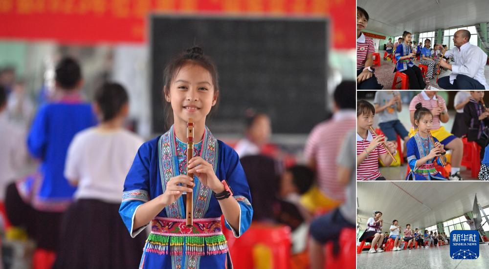 拼版照片:左图为广西三江侗族自治县10岁的小学生石金晶;右图为石金晶在县文化馆非遗公益培训班上学习吹侗笛(照片均摄于7月13日)。暑假期间,三江侗族自治县文化馆举办侗笛公益培训班,喜欢吹奏侗族乐器的石金晶报名参加。