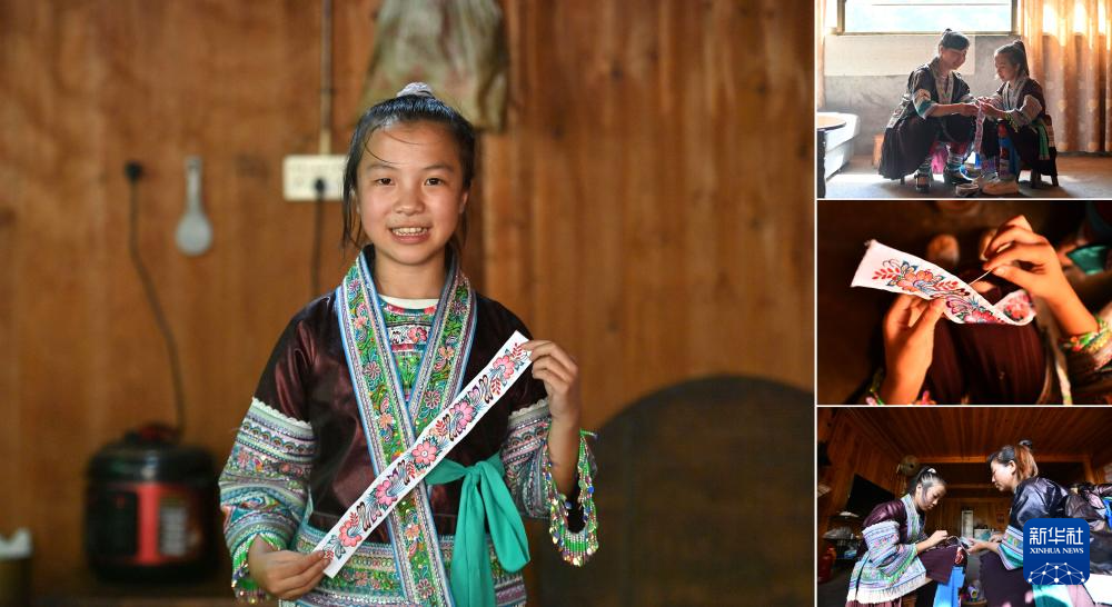 拼版照片:左图为广西融水苗族自治县杆洞乡尧告村10岁的小学生韦文慧;右图为韦文慧跟着妈妈学习苗族刺绣(照片均摄于7月6日)。暑假期间,韦文慧经常跟妈妈学习苗族刺绣,她希望长大以后做漂亮的苗衣给妈妈穿。