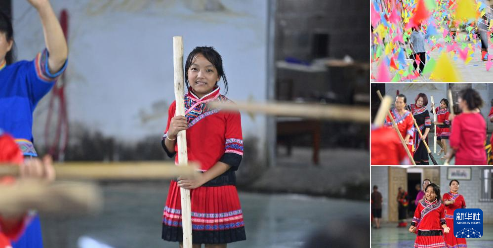 拼版照片:左图为广西大化瑶族自治县大化镇仁良村11岁的小学生韦慧熳(7月8日摄);右上图为韦慧熳跟着大人布置民俗演出场地(7月10日摄);右中、下图为韦慧熳跟着村里的舞蹈队学习跳壮族糍粑舞(7月23日摄)。壮族女孩韦慧熳很喜欢少数民族舞蹈,经常利用节假日跟老师和大人学习。