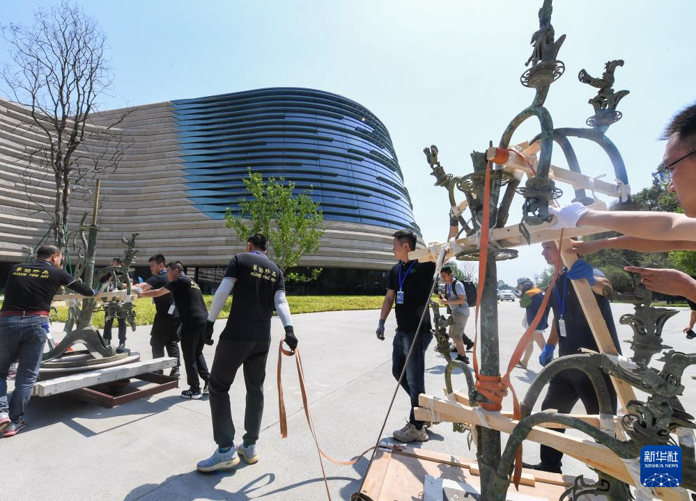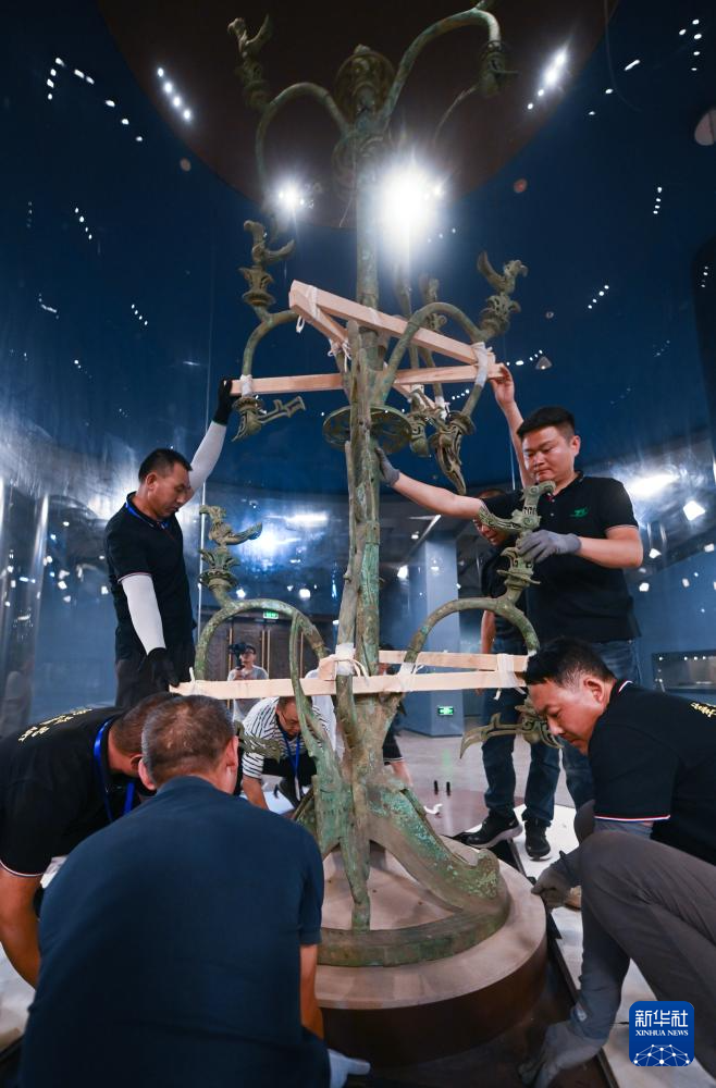 经过一个多月时间的闭馆后,7月27日,三星堆博物馆新馆在四川德阳广汉市试运行,一大批珍贵文物再次与公众见面。其中,高3.96米、重360斤的Ⅰ号大型铜神树是三星堆的“镇馆之宝”,也是新馆的“压轴之作”。在充分讨论搬迁方案后,工作人员用两天时间成功完成了它的保护性固定、分离、转运、入库等环节,并在新馆试运行后正式展出。