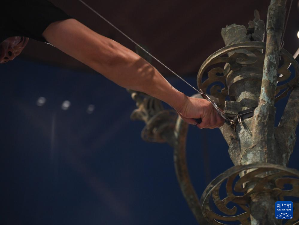 在三星堆博物馆老馆,工作人员剪断Ⅰ号大型铜神树顶部的固定线(7月16日摄)。